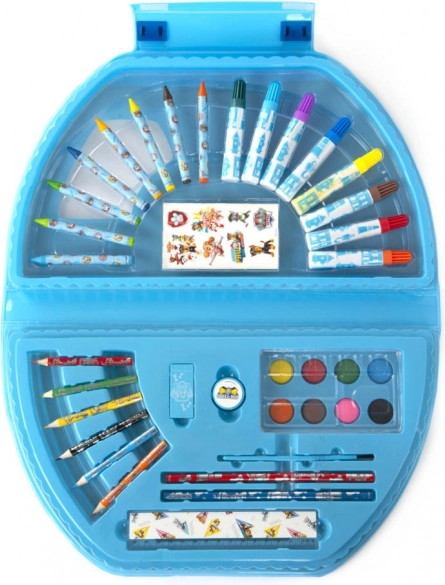 Mallette de dessin en métal Pat' Patrouille – contient des feutres, des crayons de cire, des crayons de couleur, des aquarelles, des crayons à papier, une règle, une gomme, un taille-crayon, un pinceau et des autocollants.