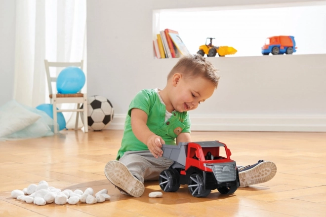 La benne basculante est équipée d’un verrou de sécurité qui empêche tout déversement involontaire de la charge – idéal pour un jeu de chantier réaliste.