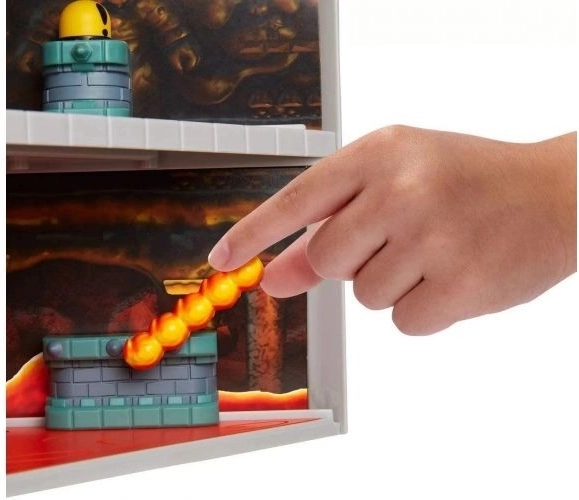 Ce coffret de jeu richement détaillé transpose un niveau iconique des jeux SUPER MARIO directement dans la chambre des enfants. Vous y trouverez des plateformes mobiles, un ascenseur, des boules de feu rotatives et une trappe dramatique qui enverra Bowser dans la « lave ». Des effets sonores réalistes intensifient chaque moment de jeu.