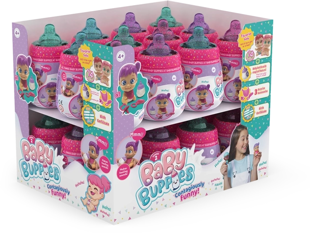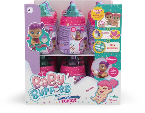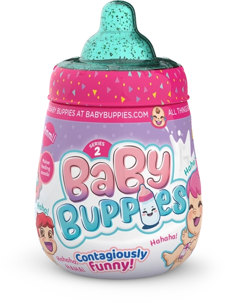 Baby Buppies, ce sont des poupées de collection ludiques dans un emballage stylé rappelant un biberon. Chaque bébé sait babiller et rire de façon réaliste, apportant émotions et fou-rires au jeu. Grâce à leurs couleurs vives et à leur design adorable, les enfants les adorent rapidement.