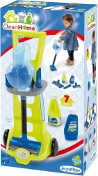 Ce chariot de ménage de la gamme Ecoiffier est équipé d’un aspirateur-balai avec trois embouts différents, de deux produits de nettoyage et d’un chariot à deux roues qui facilite le déplacement de tout l’ensemble où vous le souhaitez.