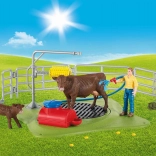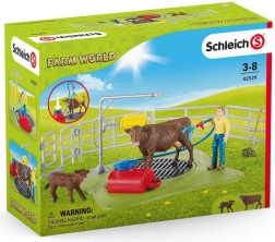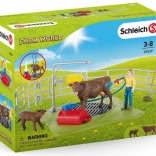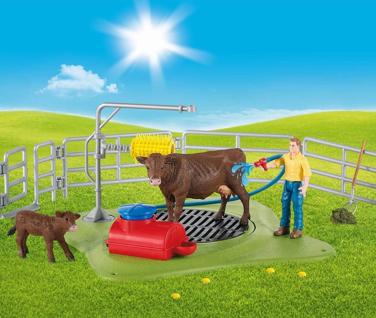 Le set comprend tout le nécessaire : figurines vache, veau et fermier, ainsi que des accessoires tels qu’un tuyau, une pompe à fonction pulvérisante, une brosse pour vaches, des clôtures en osier et un portail. Les détails de haute qualité, peints à la main et typiques de SCHLEICH, stimulent l’imagination et favorisent le jeu de rôle sur le thème de la ferme.
