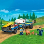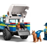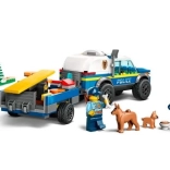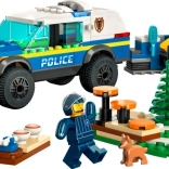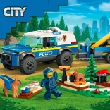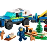 - SUV de police K9, remorque, 3 obstacles (bascule, haie, marches), décor de terrain d’entraînement, 2 minifigurines de policiers, figurine de chien et de chiot, accessoires (brosse, lampe torche, pelle, 2 friandises)