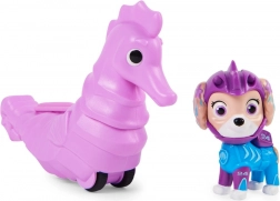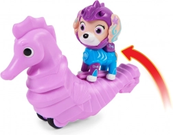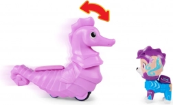 Nous vous présentons la figurine Coral de la collection Aqua Pups inspirée de la série Pat' Patrouille. Coral, à moitié sirène, porte une combinaison colorée et un casque, et sa tête est articulée. L'ensemble comprend également un hippocampe sur lequel Coral peut monter.