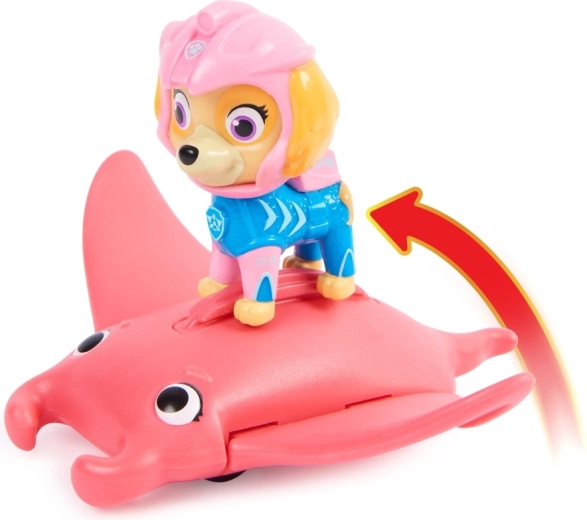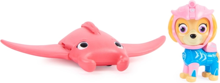 Skye dans une combinaison en néoprène toute neuve et sa fidèle amie la raie manta. Installe Skye sur la nageoire dorsale de la manta, fais avancer la manta pour activer le battement de ses nageoires et pars en mission de sauvetage. Convient à partir de 3 ans.