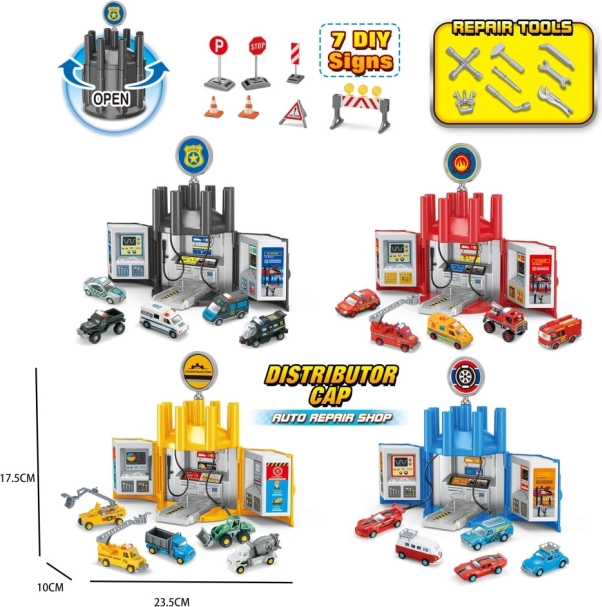 - atelier de réparation, petite voiture, panneaux de signalisation