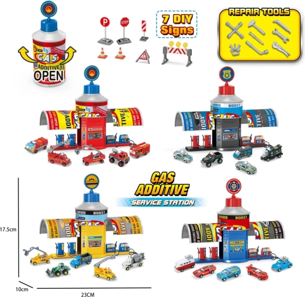 - Petite voiture, pompes à carburant, tuyaux, panneaux de signalisation et autres accessoires