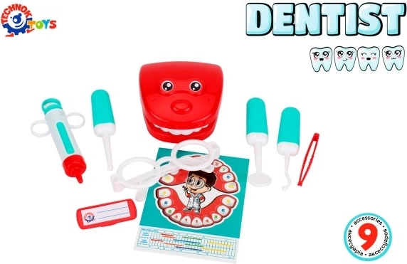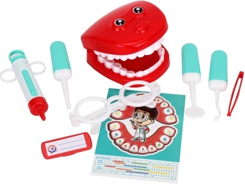Ce set dentaire coloré est idéal pour les petits docteurs curieux. Il contient tout le nécessaire pour examiner les jouets en s’amusant : modèle de mâchoires, miroir, sonde, « drille », seringue, pince, lunettes et badge. Un schéma clair de numérotation des dents est également inclus pour aider les enfants à acquérir facilement les bases des soins dentaires.