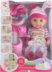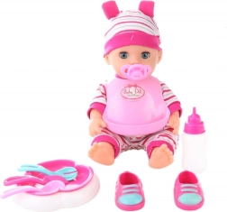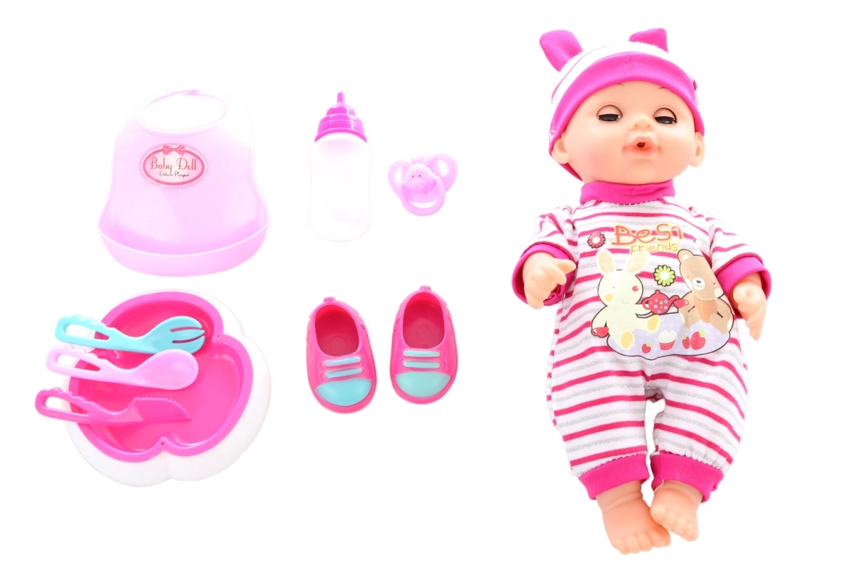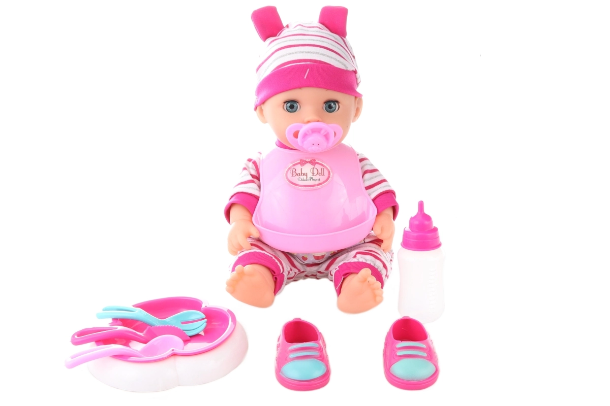 Le set comprend des petites chaussures, un bavoir en plastique, un biberon, une assiette, des couverts et d’autres accessoires pour un jeu imaginatif varié.