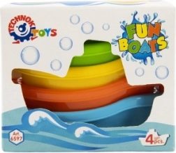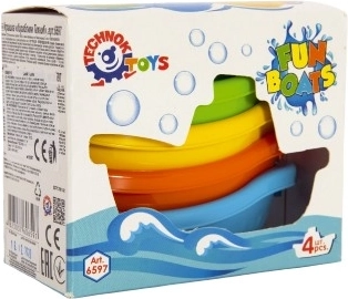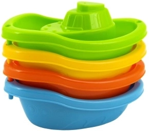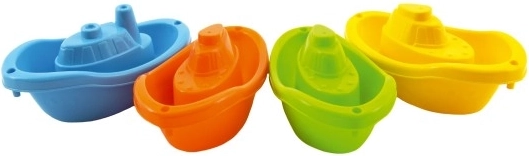 Le set comprend quatre bateaux aux couleurs vives — bleu, orange, vert et jaune — qui peuvent être facilement empilés pour un rangement simple. La forme et les couleurs des bateaux stimulent l’imagination et la créativité des enfants pendant les jeux d’eau.