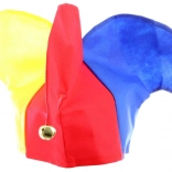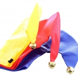 Chapeau de clown coloré en jaune, rouge et bleu avec des grelots métalliques pour un effet ludique à chaque mouvement.