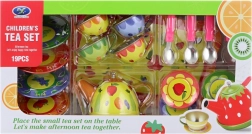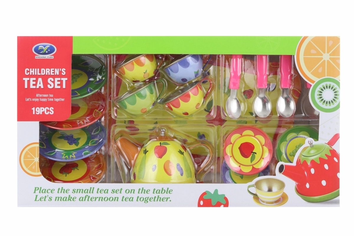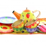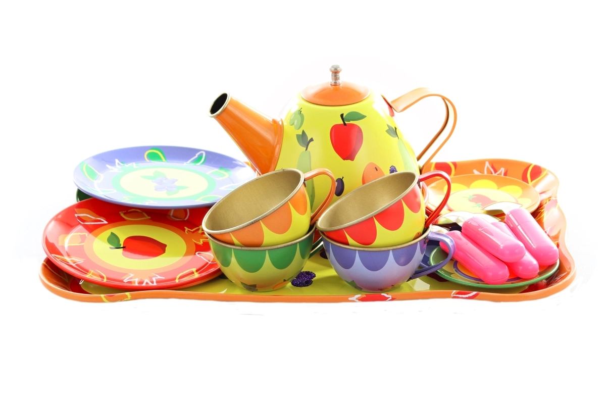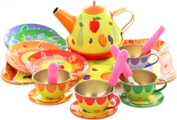 Illuminez l’après-midi des enfants avec ce service à thé coloré en métal pour petits hôtes. Le set comprend une théière, un plateau, des tasses, des soucoupes, des assiettes et des cuillères – le tout avec de joyeux motifs fruités et floraux. La fabrication robuste en métal est idéale pour jouer au goûter, et encourage l’imagination, le jeu de rôle et l’interaction sociale. Convient aux enfants à partir de 3 ans.