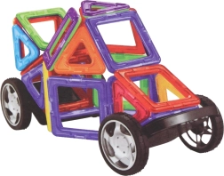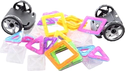 Le set comprend des formes magnétiques colorées et des roues permettant de créer diverses constructions, renforçant ainsi la perception spatiale.