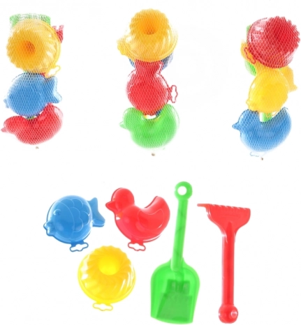 Amusant set de sable pour petits bâtisseurs, comprenant une pelle, un râteau et trois moules. Léger, facile à transporter et emballé en filet – idéal pour l’aire de jeux comme pour la plage.