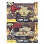 Set militaire comprenant un véhicule blindé et un soldat, idéal pour les jeunes passionnés de l'armée. Le canon du véhicule permet de tirer des fusées orange pour une action réaliste.