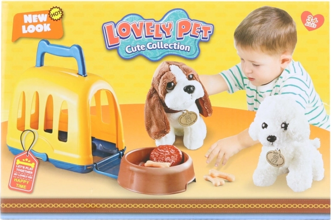 Adorable ensemble pour les petits amoureux des animaux : chien en peluche avec caisse de transport en plastique, gamelle et nourriture. Idéal pour jouer au vétérinaire et pour les voyages. Pour les enfants à partir de 3 ans.