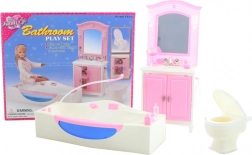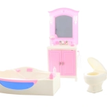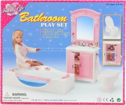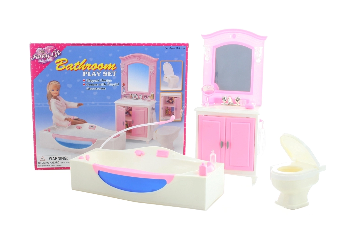 Le contenu de l’emballage inclut une coiffeuse avec lavabo, une baignoire et des toilettes, ainsi que de petits accessoires qui recréent l’ambiance d’une véritable salle de bain. La fabrication en plastique garantit un entretien facile et une longue durabilité lors d’un usage quotidien.