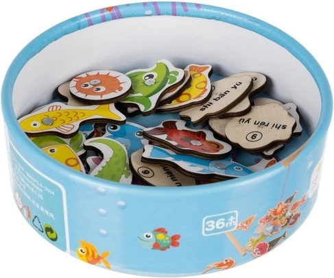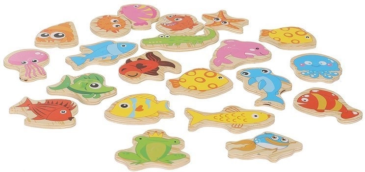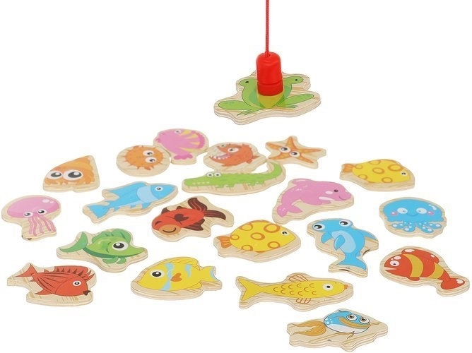 Le set comprend tout le nécessaire : 22 animaux en bois aimantés, 2 cannes à pêche en bois et un récipient rond servant d’« aquarium ». Des bords lisses et la prédominance d’un matériau naturel comme le bois en font un jouet sûr et durable pour les enfants à partir de 3 ans. Idéal pour le jeu individuel ou en groupe, et pour développer la communication et la coopération.