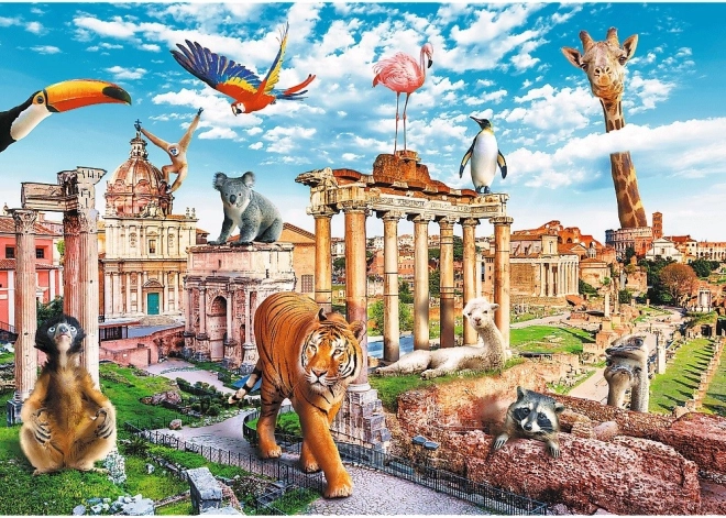 Une illustration originale qui combine monuments romains et animaux exotiques. L’image, à la fois amusante et détaillée, capte l’attention et l’assemblage plaira à toute la famille.