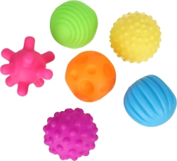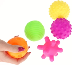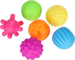 Chaque balle possède une surface unique (petites et grandes aspérités, rainurage, sillons, « hérisson ») qui stimule le toucher et la curiosité de l’enfant.