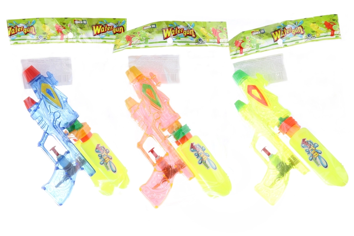 Pistolet à eau en plastique d’environ 21 cm avec deux réservoirs d’eau. Âge 3+.