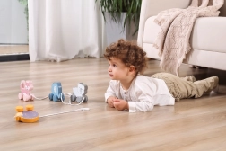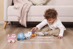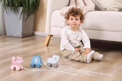 Grâce aux roues mobiles et à la possibilité de tirage, le jouet soutient le développement physique et la coordination.