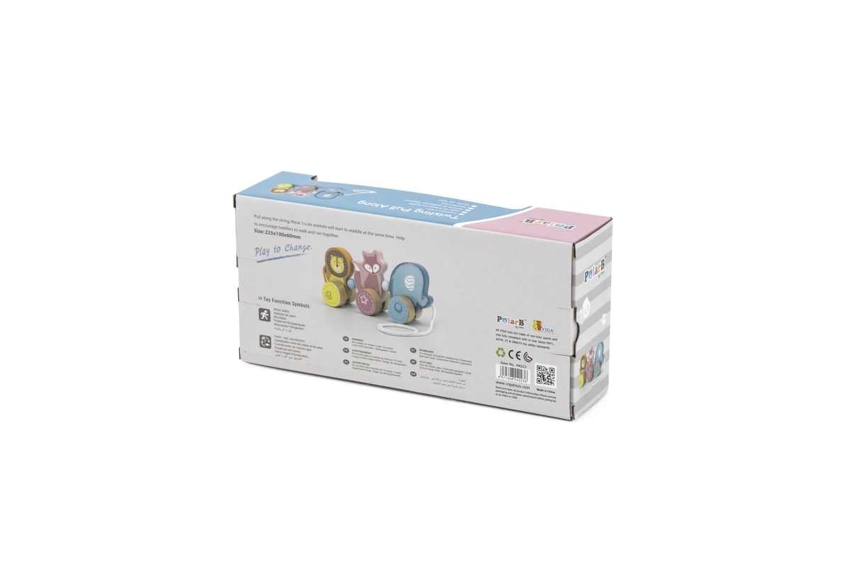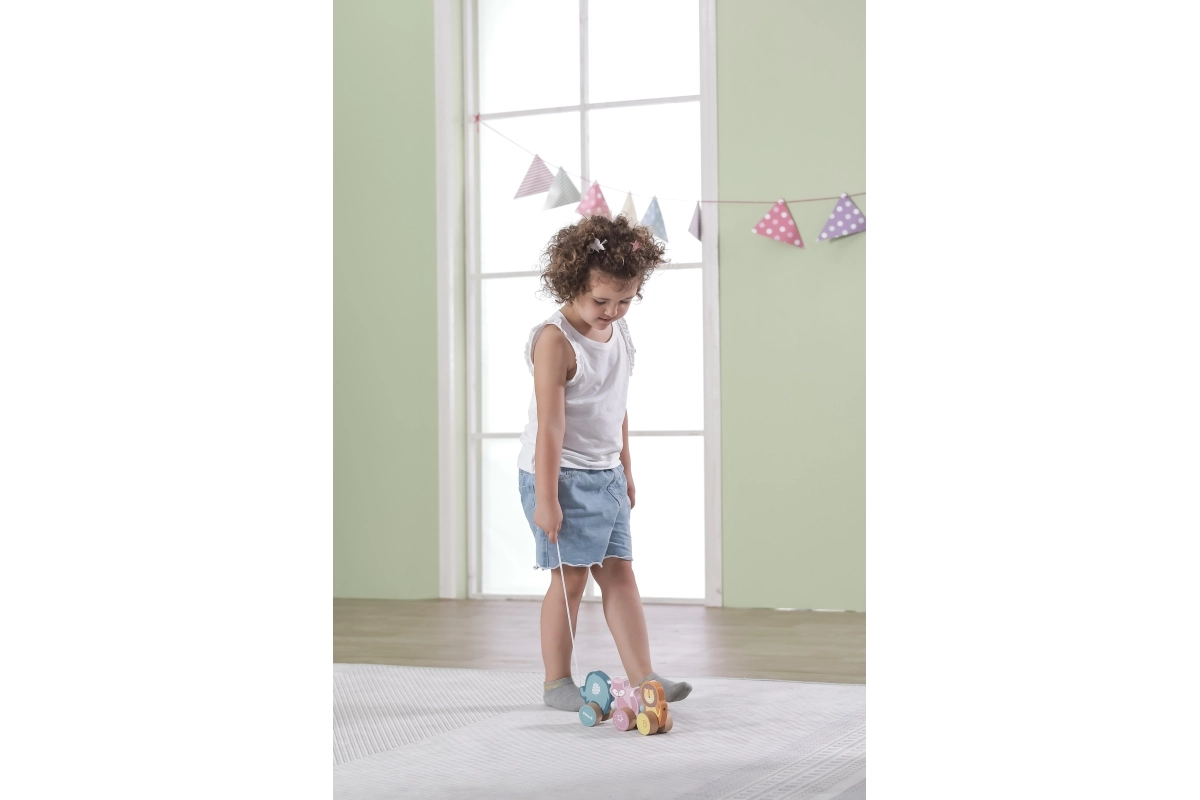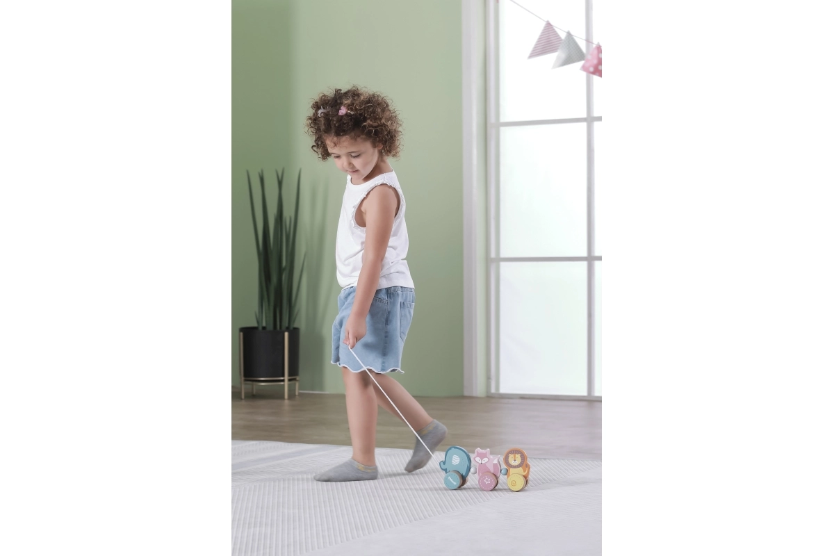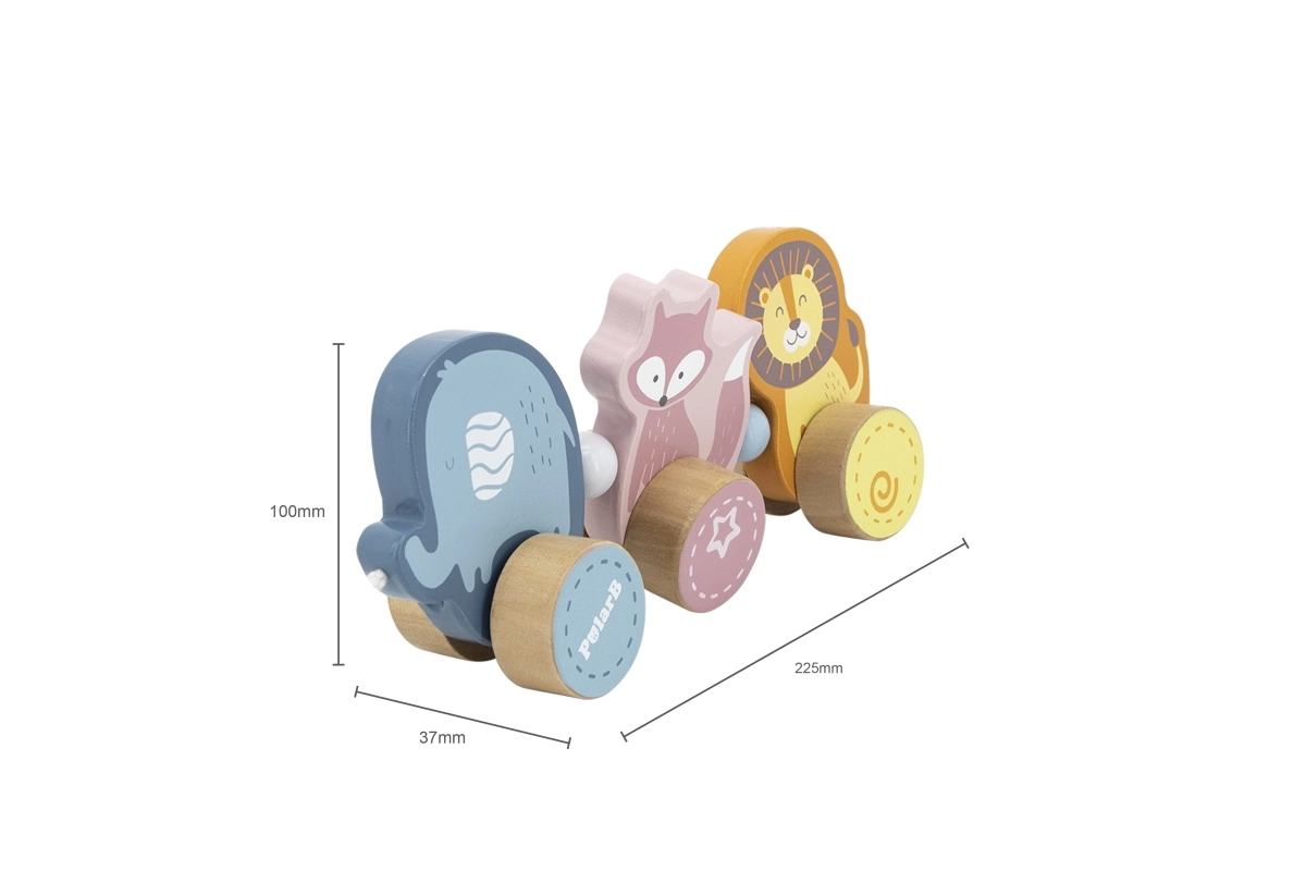 Ce jouet à tirer en bois de haute qualité, dans de doux tons pastels, est conçu pour les tout-petits qui apprennent à marcher et à découvrir le monde. Trois adorables animaux – éléphant, renard et lion – sont reliés et roulent en douceur sur des roues en bois. Grâce à la corde de traction solide, les jouets se dirigent facilement, motivent les enfants à bouger et développent naturellement l’équilibre et la coordination.
