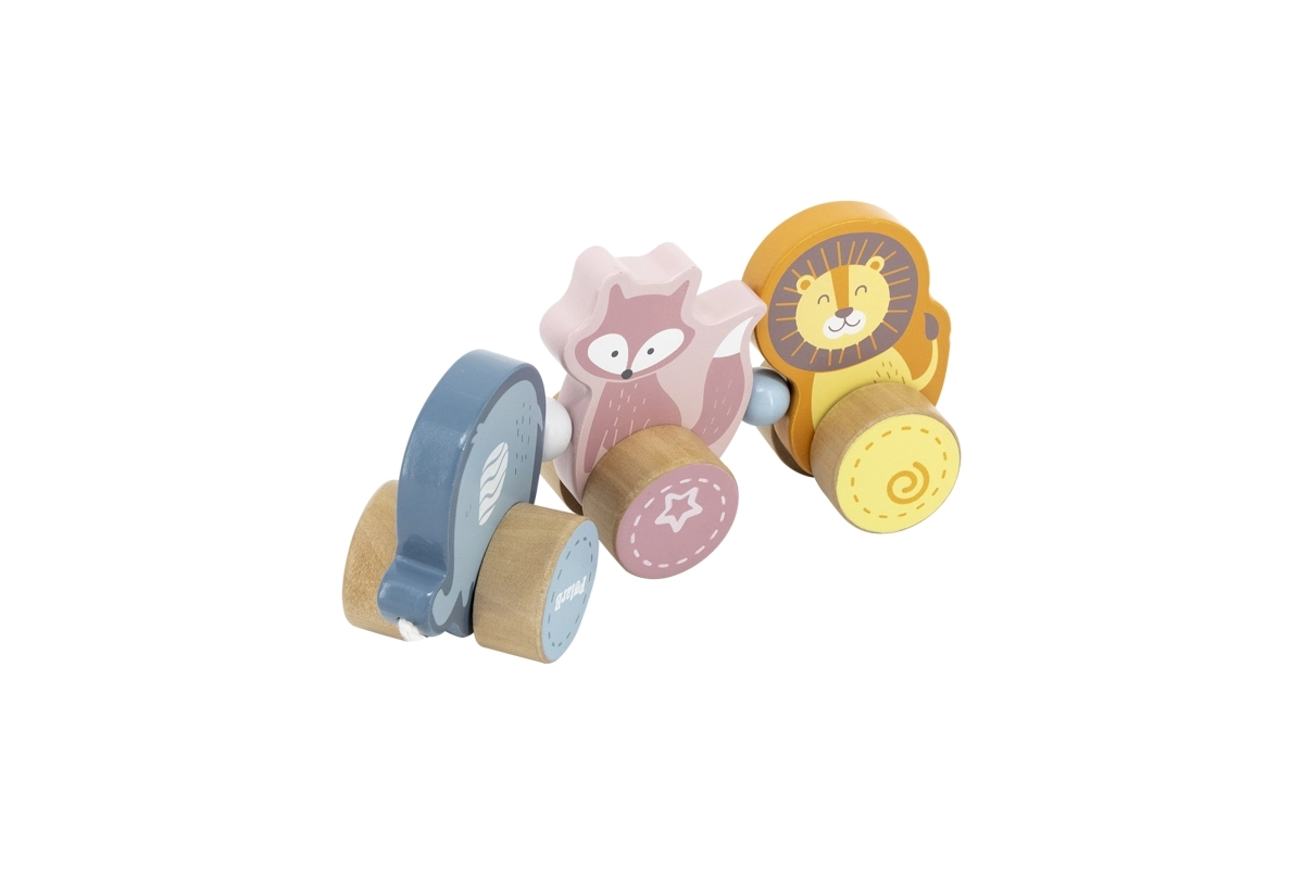 L’éléphant, le renard et le lion reliés en un petit convoi stimulent l’imagination et invitent au jeu créatif.
