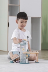 Le garage en bois offre de nombreuses possibilités de jeu interactif grâce à des fonctions intégrées telles que la station de lavage, la station-service et l’ascenseur.