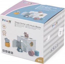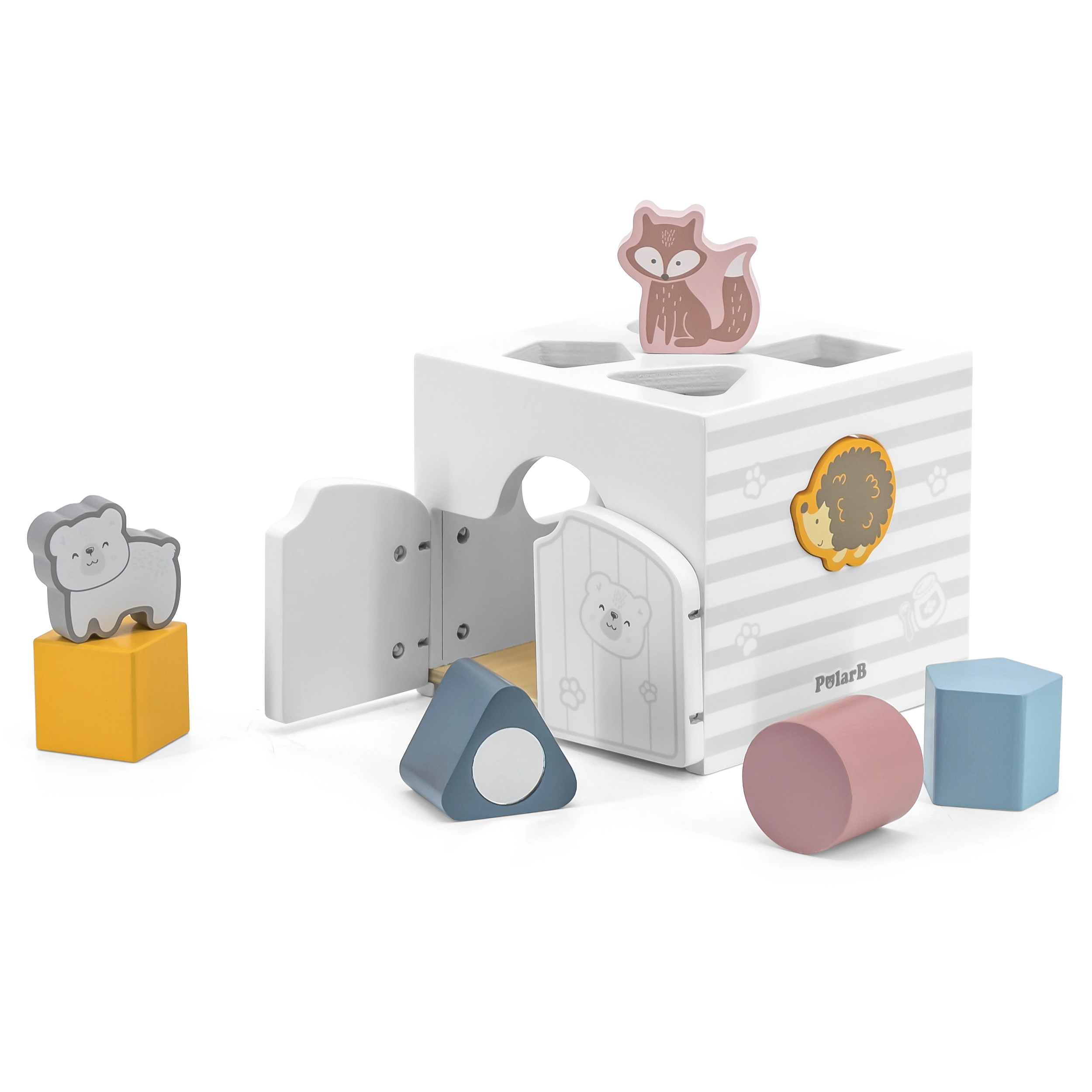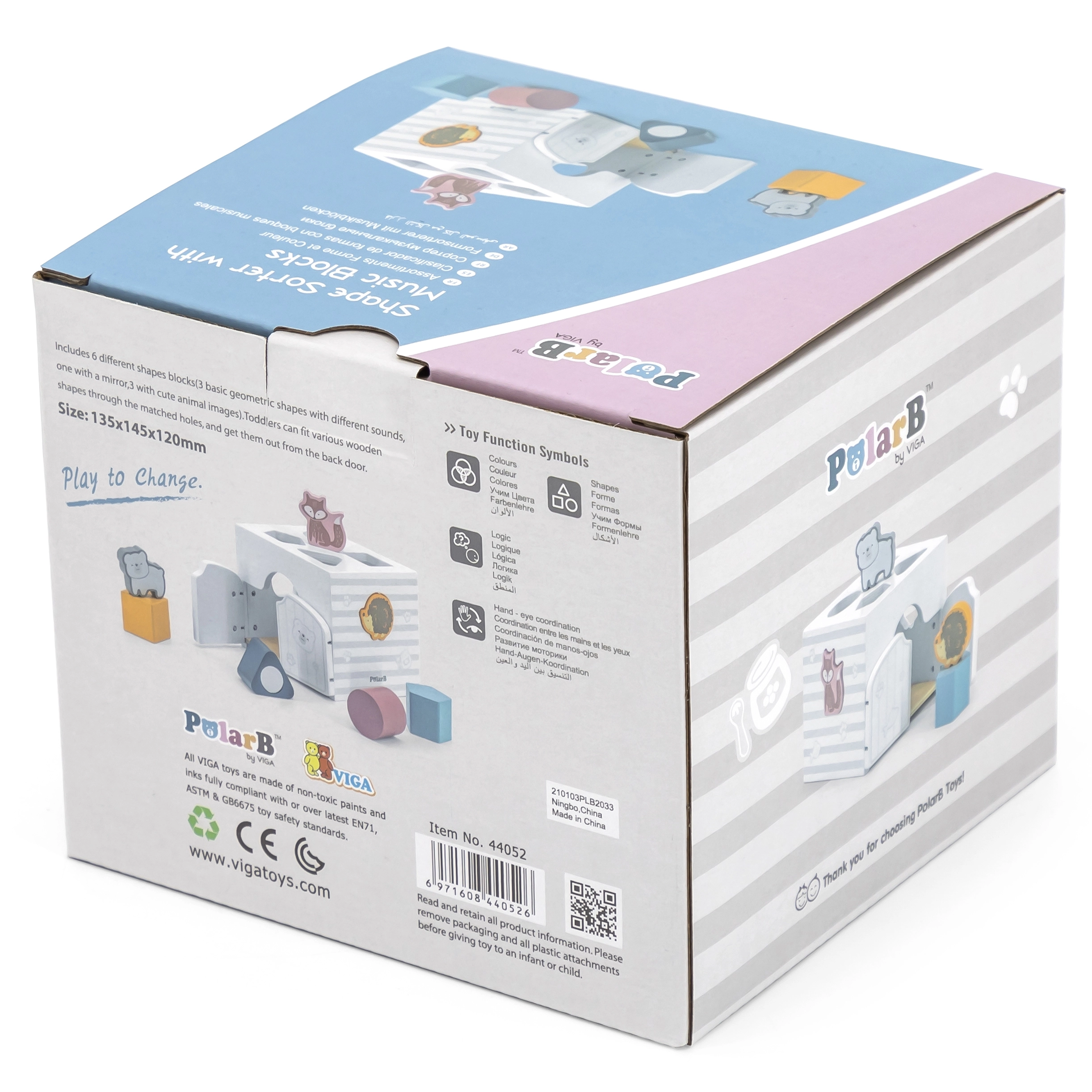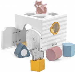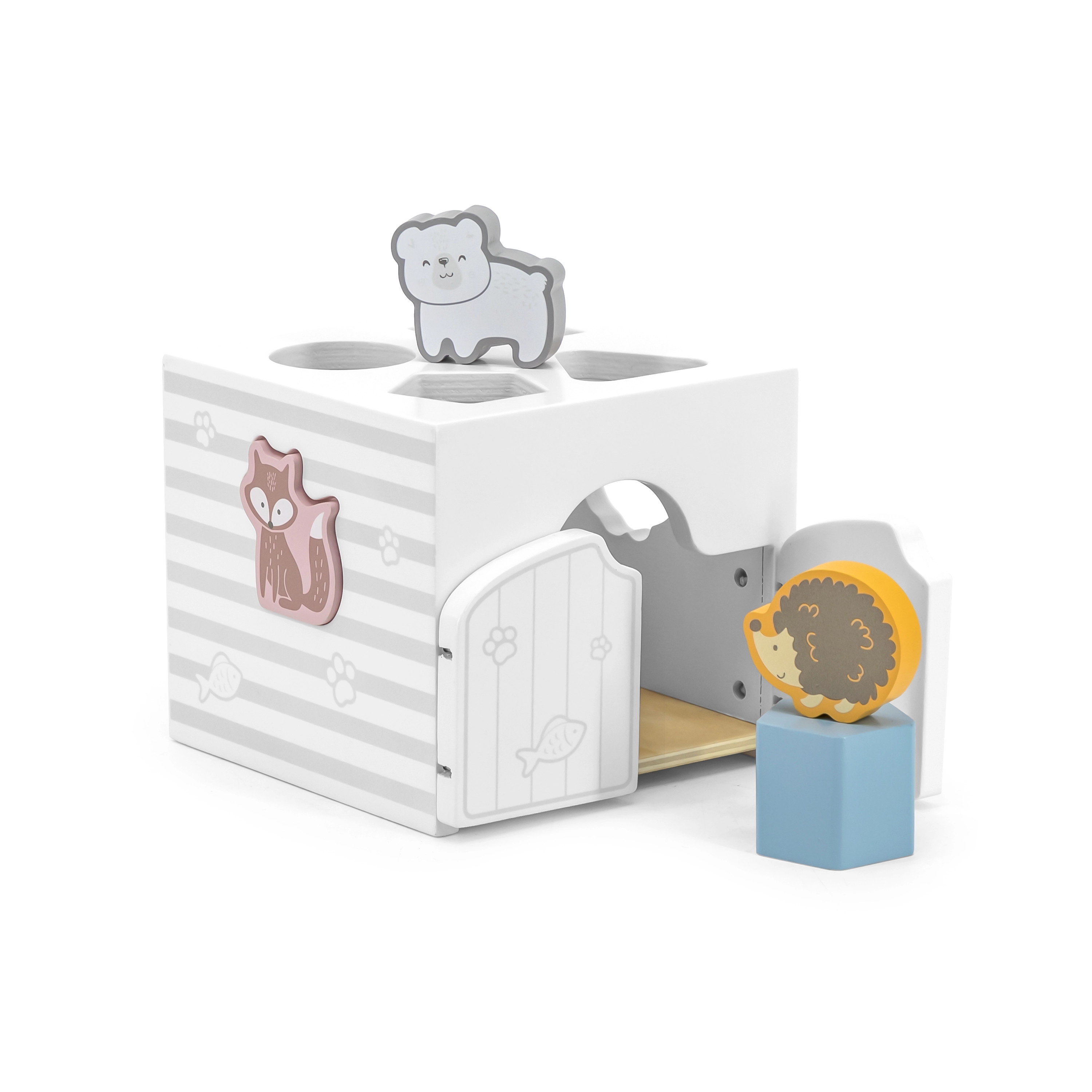 Boîte d’encastrement en bois avec animaux. Les blocs font du bruit (hochet). Dimensions de la boîte env. 13,5 × 12 × 14,4 cm. Dimensions de l’emballage env. 15 × 14,5 × 13 cm. Âge 18 mois et +