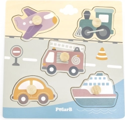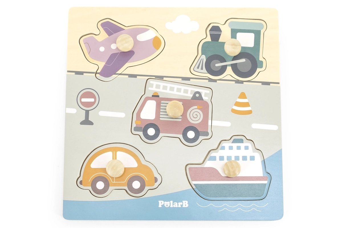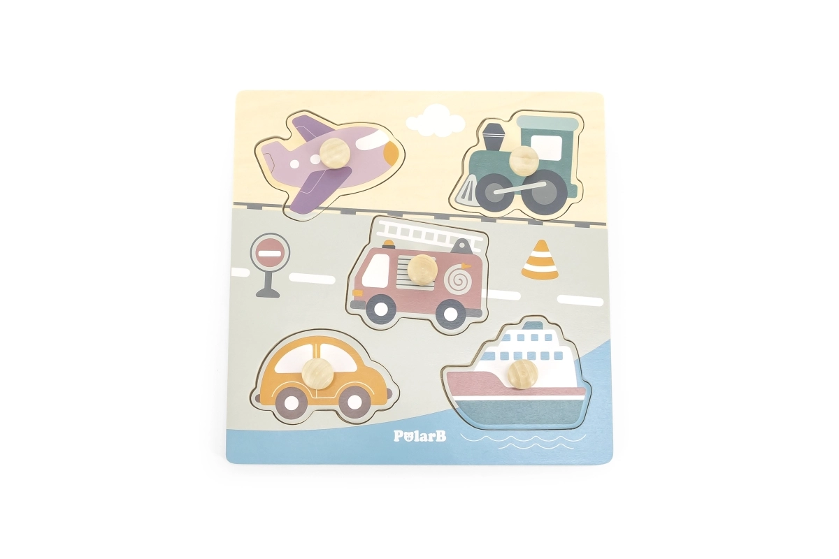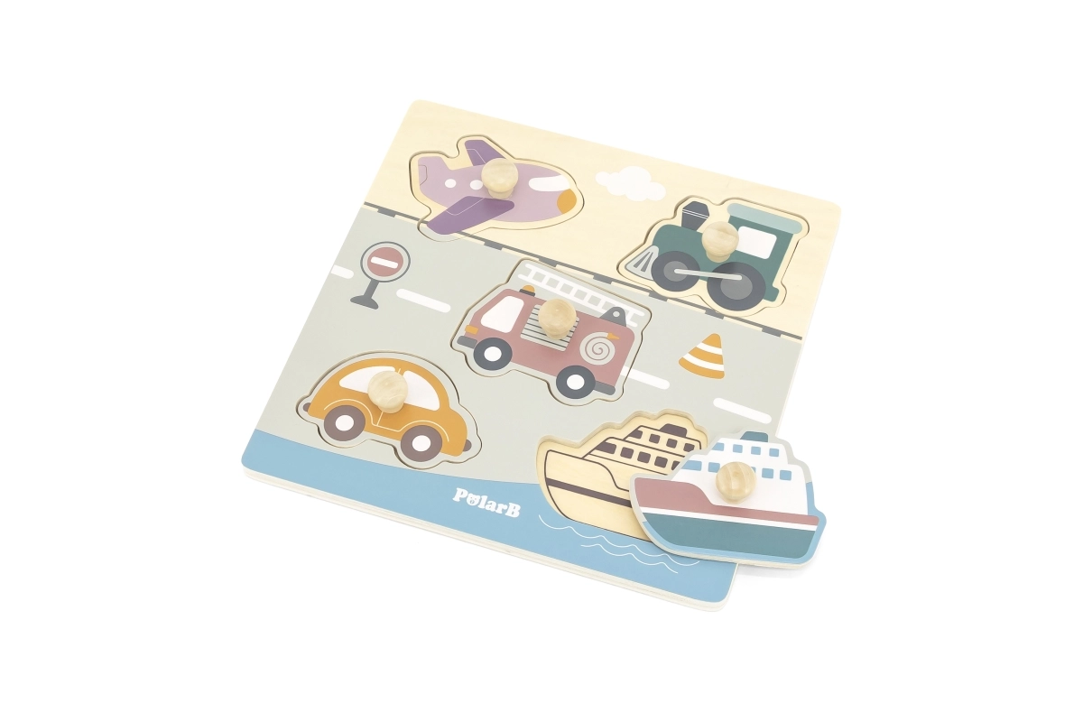 Puzzle en bois à encastrer avec motif de moyens de transport. Dimensions de la planche en bois env. 22 x 22 cm. Dimensions de l’emballage env. 22 x 22 x 2,5 cm. Âge 18 mois et plus