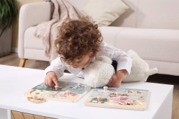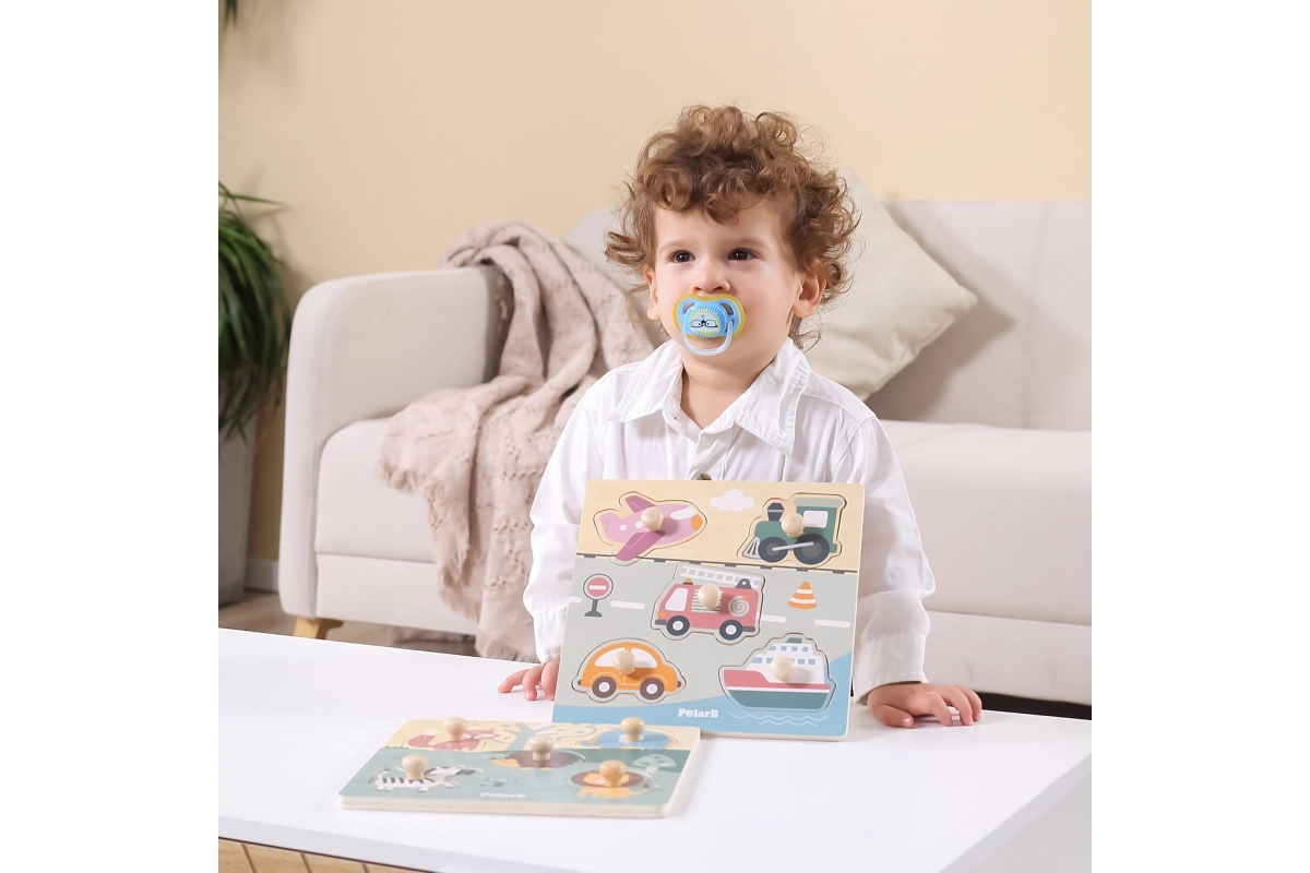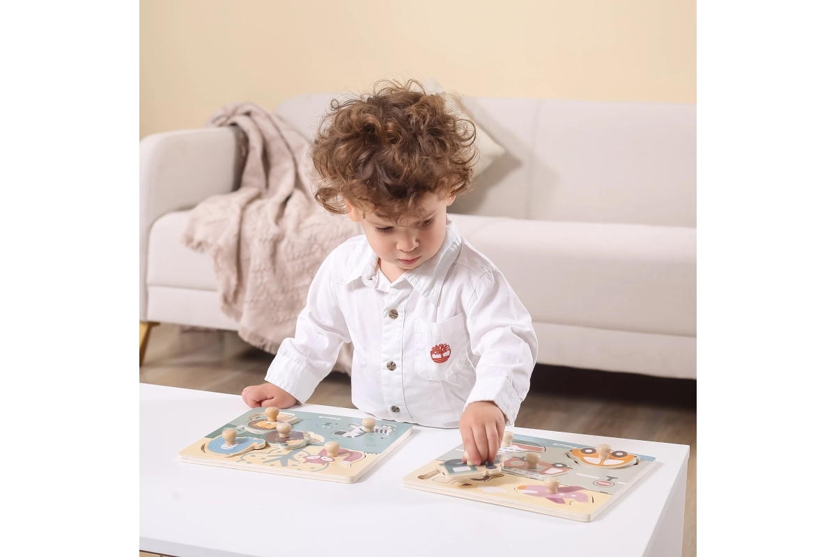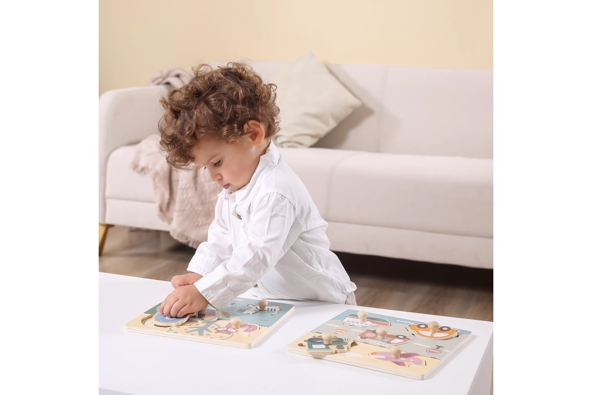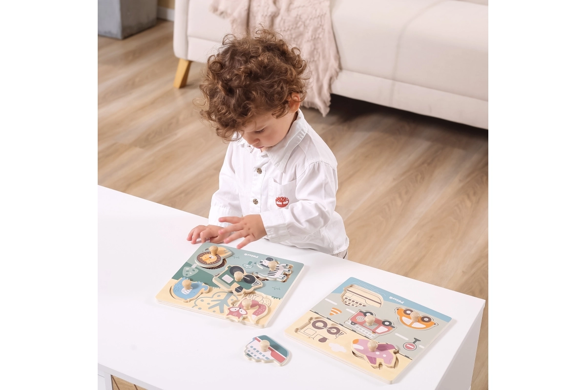 Puzzle en bois à encastrer avec motif de moyens de transport. Dimensions de la planche en bois env. 22 x 22 cm. Dimensions de l’emballage env. 22 x 22 x 2,5 cm. Âge 18 mois et plus