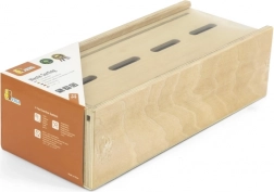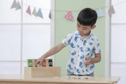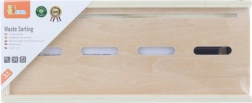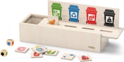 Le jouet apprend aux enfants à bien trier les déchets à l’aide de plaquettes en bois ludiques et de poubelles codées par couleur.