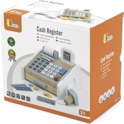 La caisse a un design réaliste avec un écran et un tiroir coulissant, offrant aux enfants l'impression d'utiliser une véritable caisse.