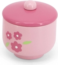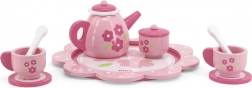 L'ensemble contient tout ce qu'il faut pour jouer aux goûters : théière, pot à lait, sucrier, tasses, soucoupes, cuillères et plateau.