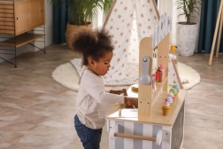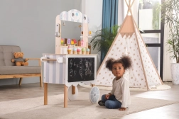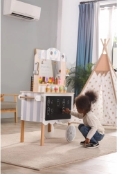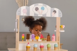 Ce set en bois fonctionne comme un magasin, une confiserie ou un stand de glaces. Les enfants peuvent jouer leur scénario préféré grâce à de nombreux accessoires tels que des sucettes, des glaces, des gaufrettes et des garnitures. Une excellente composante est le tableau pour écrire ou dessiner le menu du jour. L'ensemble est peint avec des peintures non toxiques dans des couleurs douces qui attirent l'attention des enfants.