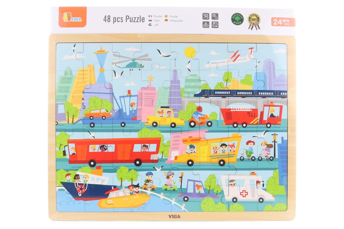 Ce puzzle en bois de qualité, représentant une scène urbaine riche et des moyens de transport variés, ravira les petits explorateurs. Grâce à ses 48 pièces et à son cadre solide, les enfants exercent leur concentration, leur coordination œil–main et leur patience. Des couleurs éclatantes et des illustrations claires les motivent à répéter l’assemblage.
