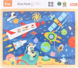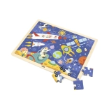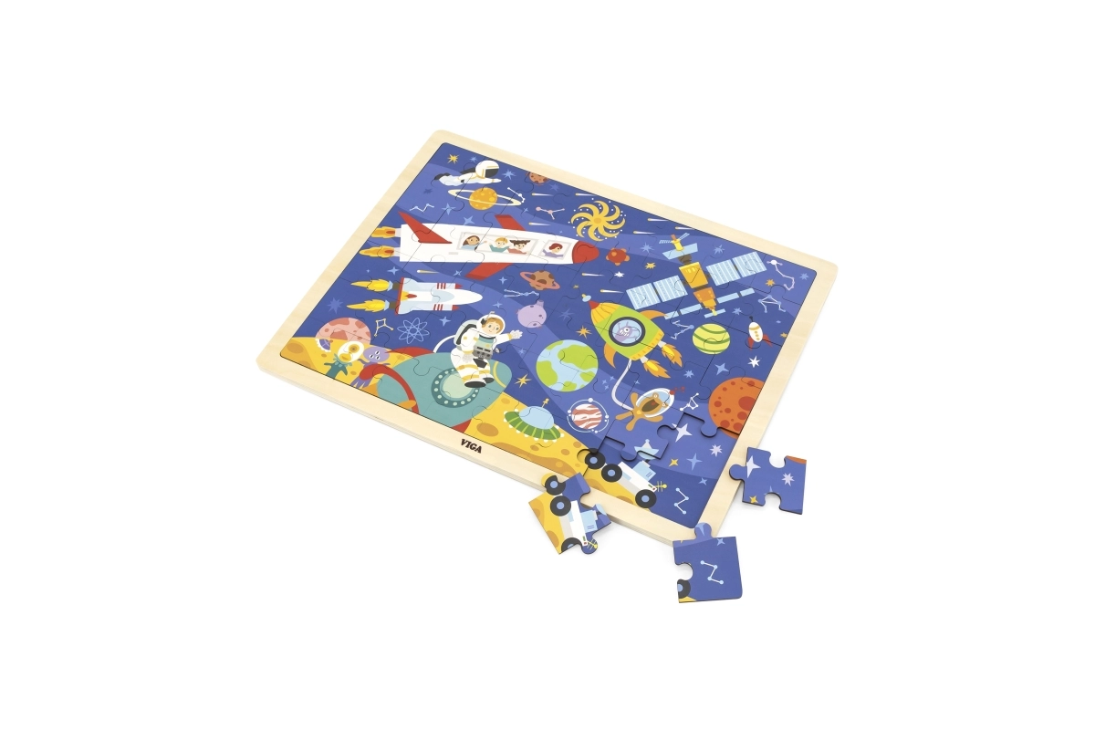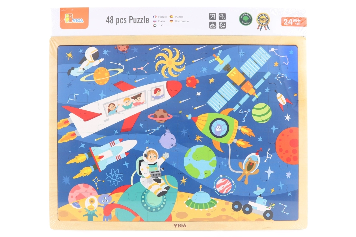 Ce puzzle en bois de qualité avec 48 pièces offre aux enfants une aventure captivante dans l’espace. Les illustrations colorées de planètes, de fusées et d’astronautes retiennent l’attention et stimulent la curiosité naturelle. Le puzzle est inséré dans un cadre en bois solide qui facilite l’assemblage et le transport.
