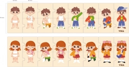 Les pièces séquentielles illustrent les phases d’habillage d’un garçon et d’une fille, permettant aux enfants d’acquérir facilement le bon ordre des activités quotidiennes.