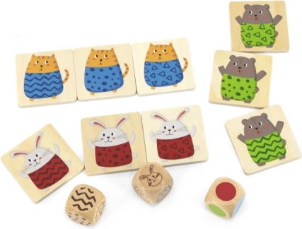 - Contenu de la boîte : 27 jetons en bois avec des animaux, 3 dés avec des symboles