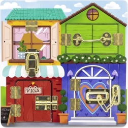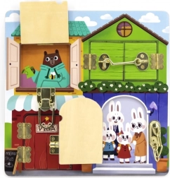 Ce tableau en bois de qualité, inspiré de la méthode Montessori, propose quatre petites portes avec de vrais verrous et loquets que l’enfant ouvre et ferme progressivement. Chaque ouverture révèle de joyeux animaux, éveillant curiosité et concentration.