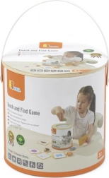 Jeu Attrape et trouve. L’ensemble comprend 20 dés, un seau en carton, 20 cartes de jeu et un couvercle. Dimensions de l’emballage env. 16 × 15,5 cm. Âge 3+