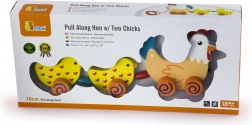 Ce jouet à tirer en bois relie une poule et deux poussins par une corde rouge. Entre les poussins se trouvent des perles colorées qui, en mouvement, stimulent la vue et l’ouïe de l’enfant. En étant tirée, toute la joyeuse « famille » se balance joliment et motive les enfants à marcher.