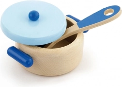 Équipement complet pour jouer à cuisiner : casserole avec couvercle, poêle avec œuf, cuillère, salière, poivrière et manique en tissu. Idéal pour les premières aventures culinaires.