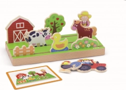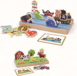 Ce jeu éducatif et amusant aide les enfants à comprendre les relations spatiales et soutient leur développement cognitif. Les enfants peuvent composer différentes scènes sur une base multicouche qui offre des aventures à la ferme et en mer.