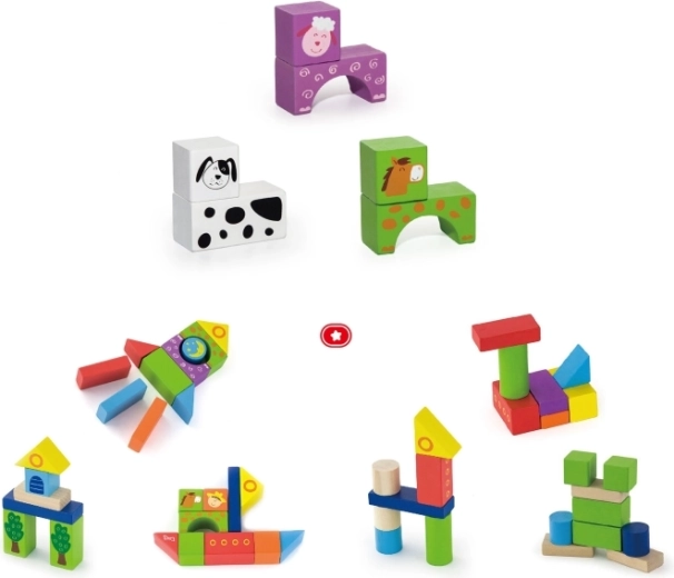 Ce jeu de construction en bois coloré sur le thème de la ferme propose 50 pièces de qualité pour des heures de divertissement. Les enfants peuvent bâtir des maisonnettes, des enclos ou de petits véhicules, développant ainsi la représentation spatiale, la coordination œil–main et la patience. Grâce à la brochure incluse avec des modèles en 3 niveaux de difficulté, débutants comme constructeurs avancés y trouveront leur compte.