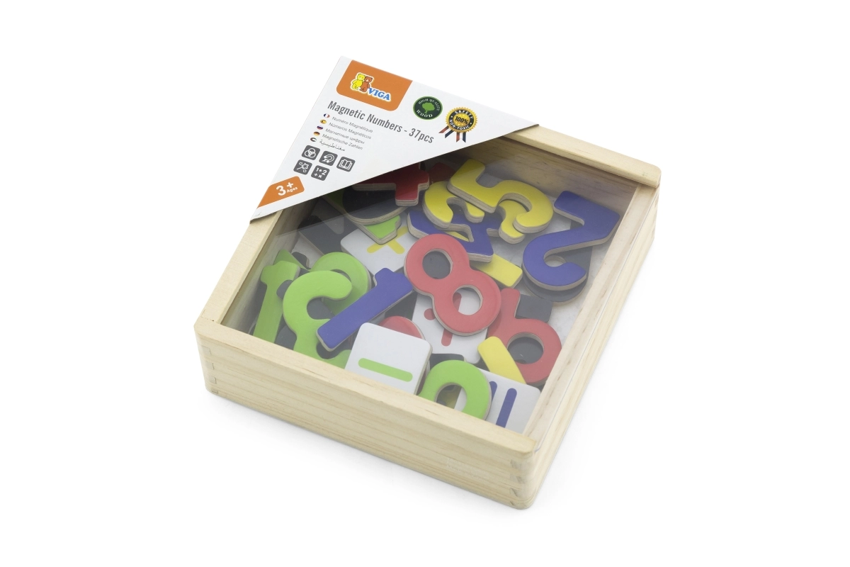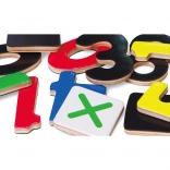 Il contient 37 pièces — chiffres et symboles mathématiques — qui adhèrent de manière fiable aux tableaux ou au réfrigérateur grâce à la couche magnétique. La construction en bois multicouche robuste et les surfaces lisses et vernies garantissent une longue durée de vie et une prise en main confortable pour les petites mains.