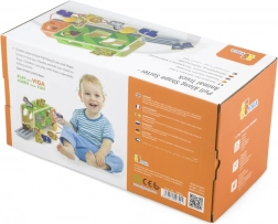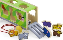 Le camion se tire à l’aide d’une ficelle et sert aussi de boîte à formes astucieuse. Les enfants mobilisent mouvement et logique en cherchant les bonnes ouvertures pour les animaux.