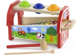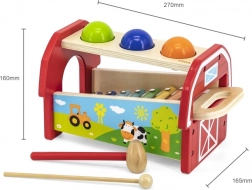 - base avec réceptacle pour billes, xylophone, marteau en bois, 3 billes colorées