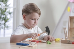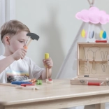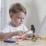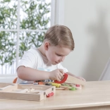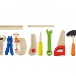 Marteau, scie, clé, tournevis et d’autres outils colorés encouragent le jeu créatif et développent la motricité fine ainsi que la coordination.